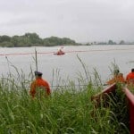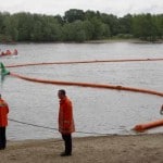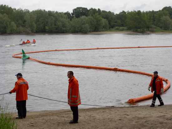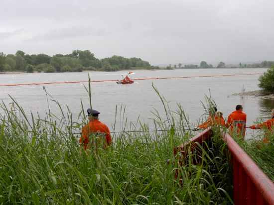 Um die Ölsperre richtig in den Strom der Elbe platzieren zu können, werden mehrere Festpunkte am Ufer benötig. Erst wenn diese fertig sind, kann die etwa 300 Meter lange Ölsperre von dem einem Boot auf das Gewässer gezogen werden. Die Boote aus Neuhaus, Scharnebeck und Walmsburg unterstützen das Bleckeder Mehrzweckboot bei dieser Tätigkeit. Um nun die Sperre auf Kurs halten zu können, wird ein sogenanntes Scherbrett zu Wasser gelassen und am Ende der Ölsperre befestigt. Dieses Brett besitzt ein eigenes Ruderblatt und hält so den richtigen Kurs. Die Sperre muss ungefähr in der Mitte des Stroms liegen und so werden die Öle bis ans Ufer geleitet und dort abgepumpt. Zugführer Jan Warner war am Ende der Übung hoch zufrieden mit der geleisteten Arbeit.