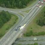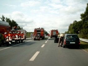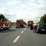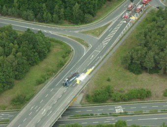 Die vielbefahrene Ostumgehung sowie die Bundesstraße 4 in Richtung Melbeck mussten sofort komplett gesperrt werden! Zahlreiche Polizeifahrzeuge, auch benachbarter Dienststellen, wurden hierzu eingesetzt, während die Feuerwehr Lüneburg erste Erkund- ungen unter Vollschutzanzügen durchführte. Es galt neben der Erkundung, im Bereich der Unfallstelle liegende Regenabflüsse abzudichten, da die Schwefelsäure auf die Ostumgehung zu tropfen drohte! Bereits nach kurzer Zeit war klar, dass dieser Einsatz viele Stunden andauern wird und eine grössere Menge an CSA-Trägern erforderlich wird. Daher wurden in der Folgezeit sämtliche Kräfte der Feuerwehr Lüneburg sowie die Gefahrgutgruppen der umliegenden Gebietskörperschaften alarmiert. Als richtige Entscheidung erwies sich hierbei die Nutzung eines sogenannten “Voralarms”, mit dem einsatzbereite Kräfte beispielsweise an ihren Arbeitsstätten von dem Einsatz in Kenntnis gesetzt werden konnten, sodass ein spätere “Teilnahme” ermöglicht wurde. Ein weiterer Tanklastzug wurde unter Polizeibegleitung aus Hamburg zum Umpumpen der Schwefelsäure angefordert, die Straßenmeisterei baute zahlreiche Umleitungen auf, ein Polizeihubschrauber kreiste über der Einsatzstelle (siehe Luftbild mit Genehmigung der Polizeiinspektion Lüneburg) und der Rettungsdienst stand aus Gründen der Eigensicherung in Bereitschaft. Gegen 12.10 Uhr wurde nach zuvor erfolgtem Voralarm der Gefahrstoff- und Umweltzug der Stadt Bleckede alarmiert. Die FF Bleckede-Mitte rückte mit ELW und LF 16-TS aus, von den Feuerwehren aus Garze folgten LF 8 sowie von Garlstorf das LF 16. Im Zugverband ging es Richtung Lüneburg, wobei unter Nutzung des o.g. Voralarms weitere Kräfte an einem zuvor abgesprochenen Punkt aufgenommen wurden. Ihre Einsatzkleidung wurde in den Feuerwehrhäusern verladen. Im Anschluß ging es in den Bereitstellungsraum im Bereich der “Roten Schleuse” in Lüneburg. Ein Trupp unter CSA wurde dann noch zum Einsatz gebracht im Rahmen der Aufräumarbeiten. Am späten Nachmittag war das verunfallte Fahrzeug geborgen. Intensive Säuberungsarbeiten mussten noch folgen. Die Sperrung konnte dann erst gegen 22.00 Uhr aufgehoben werden. In einer ersten Bilanz kann von einer durchweg positiven Einsatzbewältigung gesprochen werden!