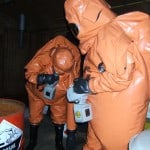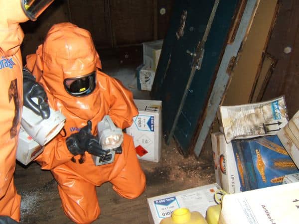 Das Areal um die Unfallstelle wurde hierfür weiträumig abgesperrt und die ersten Trupps unter CSA gingen zum Objekt vor. Der erste Trupp hatte erst einmal die Aufgabe, zu erkunden und alles an die Absperrgrenze zu übermitteln was ihnen auffällt. Weitere Trupps kamen dann zur Verstärkung und dichteten gegebenenfalls Leckaschen an den Fässern ab. Zur selben Zeit kam nun der ABC-Zug ins Spiel. Sie haben die Konzentration giftiger Dämpfe in der Atmosphäre gemessen.