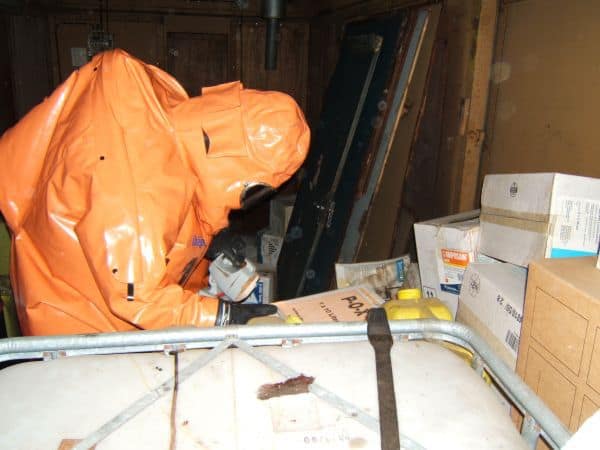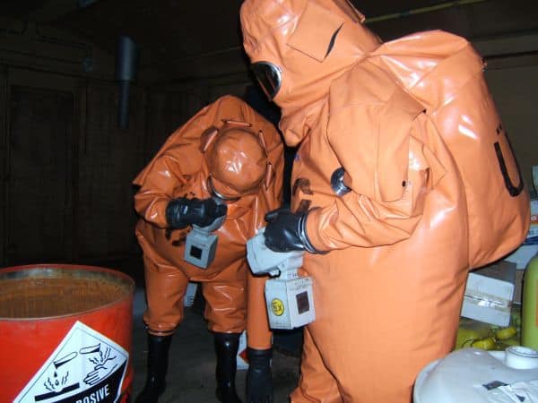 Das Areal um die Unfallstelle wurde hierfür weiträumig abgesperrt und die ersten Trupps unter CSA gingen zum Objekt vor. Der erste Trupp hatte erst einmal die Aufgabe, zu erkunden und alles an die Absperrgrenze zu übermitteln was ihnen auffällt. Weitere Trupps kamen dann zur Verstärkung und dichteten gegebenenfalls Leckaschen an den Fässern ab. Zur selben Zeit kam nun der ABC-Zug ins Spiel. Sie haben die Konzentration giftiger Dämpfe in der Atmosphäre gemessen.
