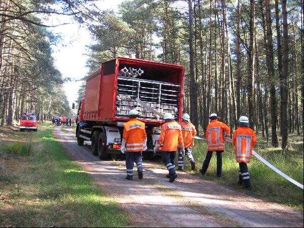 Am Samstag gegen 9.00 Uhr begann dann die größte der Übungen, dabei handelte es sich um einen angenommenen Waldbrand in der Ahrensheide. Hier wurden nach und nach die KFB Lüchow-Dannenberg, Uelzen, Celle, Lüneburg und Wolfsburg zusammengezogen. Es wurden mehrere Wasserentnahmestellen an der Böhme eingerichtet, unter anderem auch eine Pumpe durch das THW in Stellung gebracht, die bis zu 5000 Liter Wasser pro Minute fördern konnte. Es wurden mehrere Einsatzabschnitte gebildet um das Feuer zu bekämpfen, die Wasserversorgung wurde mit B-Schläuchen über weite Wegstrecken sowie mittels Tanklöschfahrzeugen im Pendelverkehr sichergestellt. Parallel dazu lief noch eine Waldbrandübung in Hademstorf, während die letzten beiden Einsatzlagen erst am späten Samstagabend in Rethem und Bomlitz abzuarbeiten waren. Dort war es zu Bränden und einem Verkehrsunfall gekommen, bei dem Personen mittels hydraulischem Rettungsgerät befreit werden mussten.