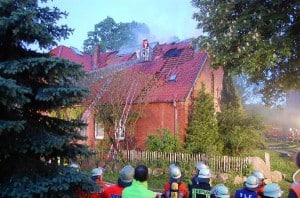 Anforderung Drehleiter, Dachstuhlbrand in Nieperfitz