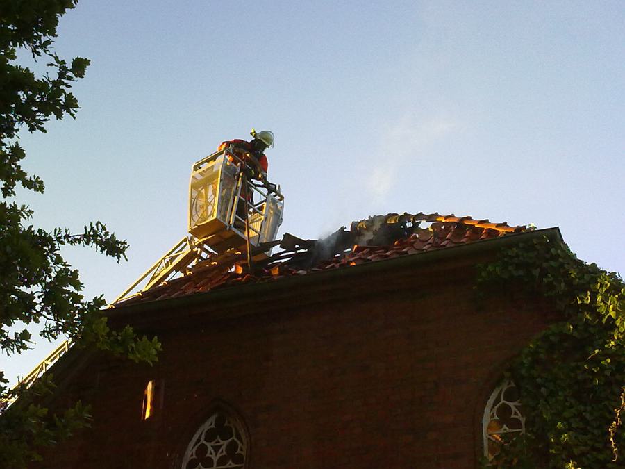 Anforderung Drehleiter, Dachstuhlbrand in Nieperfitz