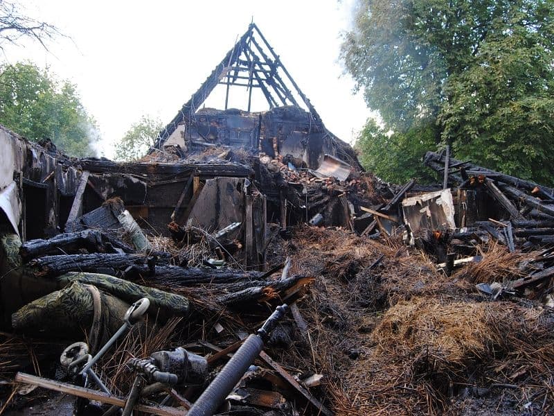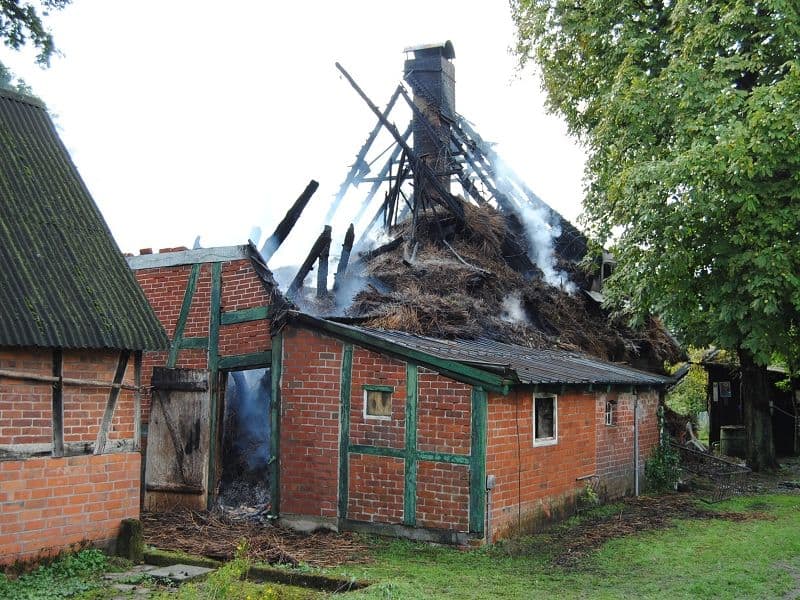 Ein Großfeuer in Barförde sorgte am späten Sonntagabend für ein enormes Kräfteaufgebot der Feuerwehren der Samtgemeinde Scharnebeck und der Stadt Bleckede. Um 20 Uhr ging in der Feuerwehreinsatzleitzentrale ein Notruf über einen Schuppenbrand ein, der auf das benachbarte Wohnhaus überspringen zu drohte. Die Hauseigentümerin befand sich zu diesem Zeitpunkt noch im Haus. Die ersten eintreffenden Einsatzkräfte bemerkten schnell, dass die Hauseigentümerin von den anliegenden Campern gerettet wurde und dass das Feuer bereits auf das Wohnhaus übergriff. Trotz der schnellen Löschangriffe konnten die Einsatzkräfte das Feuer nicht eindämmen. Nach kürzester Zeit stand der ganze reetgedeckte Dachstuhl in Flammen. Von allen Seiten versuchten die Einsatzkräfte, dass Feuer zu löschen. Durch die Gefahr, dass das Gebäude sowie der Schornstein einzustürzen drohte, war ein Abnehmen des Daches nicht möglich. So mussten die knapp 230 Kräfte der Feuerwehr nach fünfstündiger Löscharbeit die Arbeiten einstellen und auf den nächsten Tag hoffen. Bis auf die Feuerwehren Artlenburg und Brietlingen, die als Nachtwache vor Ort blieben um noch erreichbare Glutnester abzulöschen.