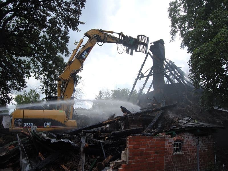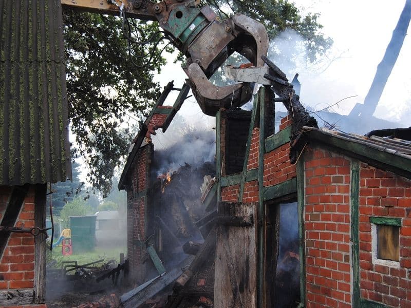 Am folgenden Tag wurde das Abrissunternehmen TIRS aus Tespe an die Einsatzstelle berufen, diese sollten mit ihrem Abrissbagger die Glutnester freilegen und den Schornstein herunter holen, damit ein Einstürzen des Gebäudes ausgeschlossen werden konnte. Gegen 07.00 Uhr wurde die Nachtwache durch die Feuerwehren Hohnstorf und Barförde abgelöst. Diese führten dann die Nachlöscharbeiten weiter durch. Durch die Hilfe des Baggers konnten alle restlichen Glutnester freigelegt und gelöscht werden. Gegen 14:30 Uhr konnte „Feuer aus“ gemeldet werden. Zum Einsatz kamen 8 B-Rohre und 15 C-Rohre. Der Einsatz der Drehleiter aus Bleckede konnte aus Gründen schlechter Bodenverhältnissen nicht durchgeführt werden.