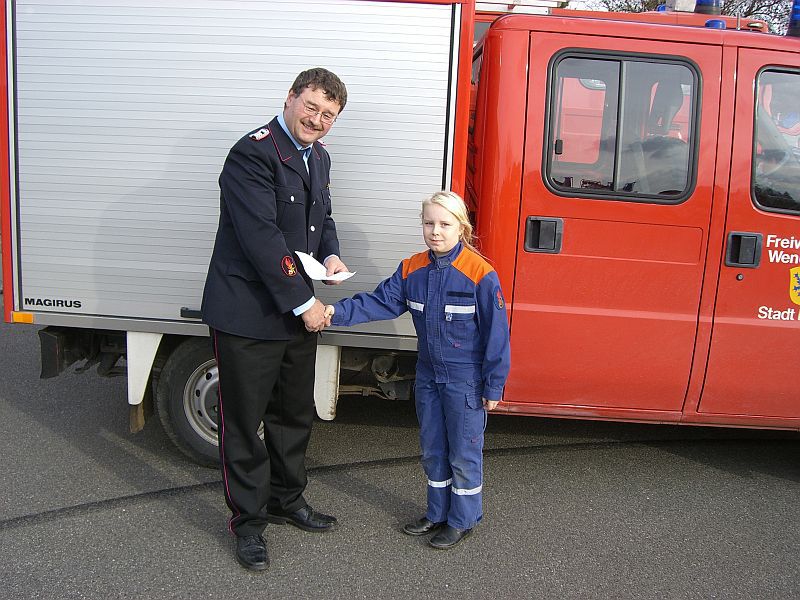 Nach der Prüfung erhalten alle Jugendfeuerwehrmitglieder das Abzeichen der Jugendflamme. Sie können im nächsten Jahr die Prüfung der Jugendflamme Stufe 2 absolvieren.