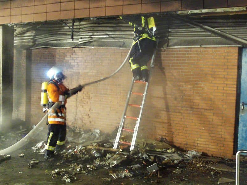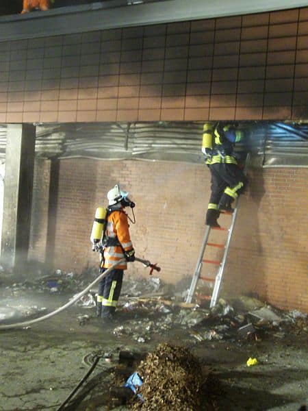 Foto 1: Brandbekämpfung an den Müllcontainern (Reste der Müllcontainer, Foto oben)