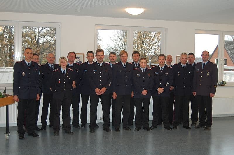 Gruppenbild der Teilnehmer mit Kreisbrandmeister Torsten Hensel (rechts), in der Mitte: Ortsbrandmeister Friedhelm Hinrichs aus Walmsburg