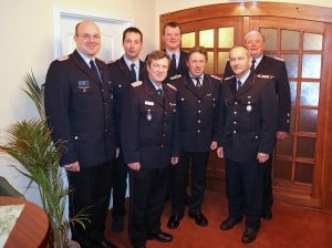 Kreisbrandmeister Torsten Hensel, Andreas Kade, Matthias Kleps, Carsten Gieseler, Hartmut Deeke, Reinhard Hoppe und Verbandsvorsitzender Henning Banse