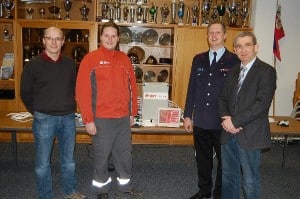 Hartmut Jäger, Kommunalreferent, und Carsten Braumann, Ausbildungschef der E.ON Avacon Lüneburg überreichten gemeinsam mit dem Auszubildenden Jonas Nagel den elektronisch ansteuerbaren Signalgeber.