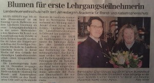 Frau Carola Bullmann ist die erste Teilnehmerin an der Niedersächsischen Akademie für Brand- und Katastrophenschutz (NABK) am Standort Celle. Sie kommt von der FF Bleckede, Ortsfeuerwehr Karze, aus dem Landkreis Lüneburg und besucht den Gruppenführer-Lehrgang, Teil 1.