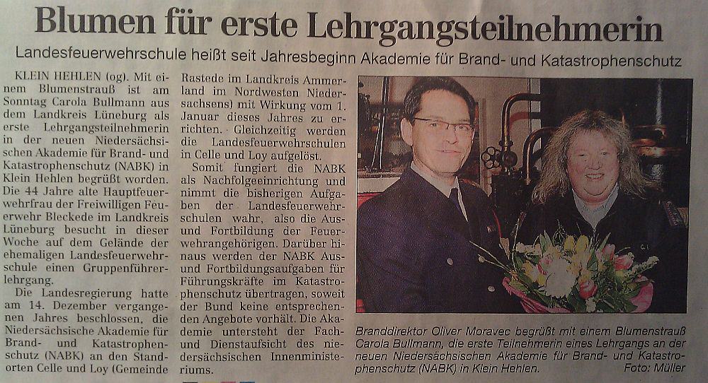 Frau Carola Bullmann ist die erste Teilnehmerin an der Niedersächsischen Akademie für Brand- und Katastrophenschutz (NABK) am Standort Celle. Sie kommt von der FF Bleckede, Ortsfeuerwehr Karze, aus dem Landkreis Lüneburg und besucht den Gruppenführer-Lehrgang, Teil 1.