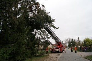 Mit Kettensäge und Drehleiter wurde die Gefahr beseitigt. Neun Einsatzkräfte waren eine Stunde beschäftigt.