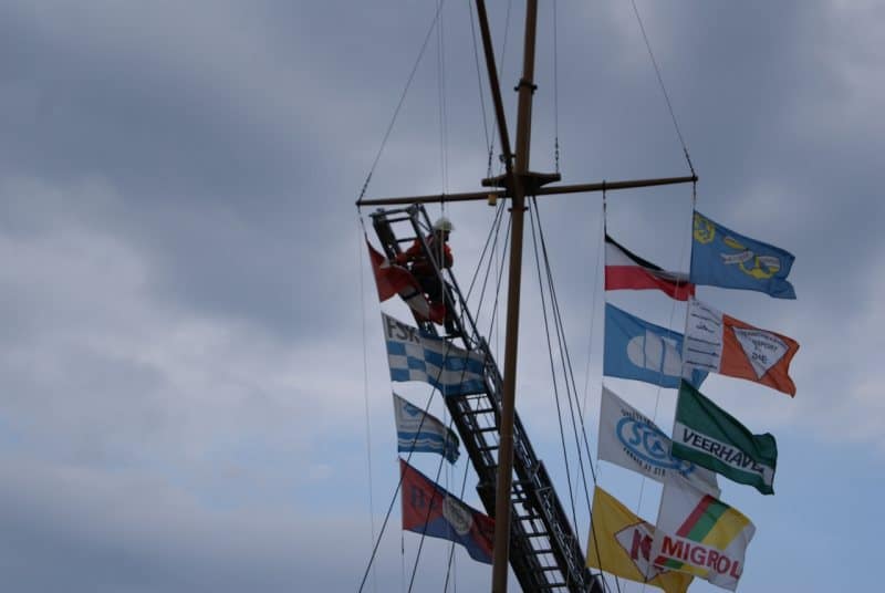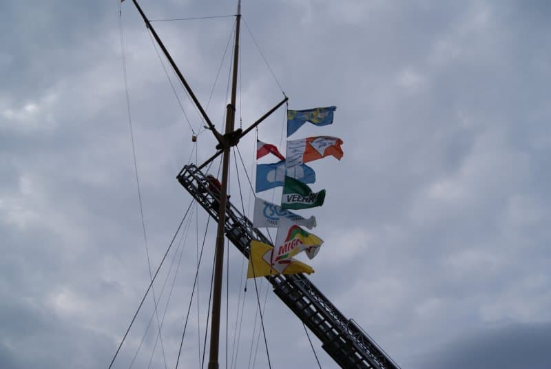 Die Flaggenleinen (Leinen zum Hochziehen der Flaggen) sind in den letzten Jahren verschlissen – somit mussten neue Leinen am Mast eingefädelt werden. Mit der Drehleiter waren die Rollen in 13 Metern Höhe gut erreichbar und das einfädeln eine reine Fleißarbeit.