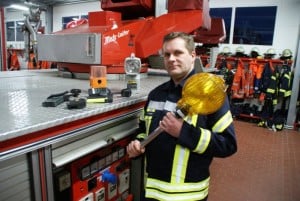 Matthias Garms, Gerätewart der Feuerwehr Bleckede, mit akkubetriebenen Feuerwehrgeräten.