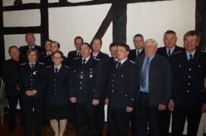 Bevor es zum gemütlichen Teil des Abends mit einem herzhaften Imbiss überging, standen zum offiziellen Sitzungsende noch die Mitgliederehrungen an. Ausgezeichnet wurden Dennis Hensling und Helmut Storm für je 25 Jahre, Uwe Ludwig und Otto Selonke für je 40 und Hartmut Giering für 50 Jahre Mitgliedschaft. Zwar waren die Ehrenabzeichen für die Uniformjacke „aus organisatorischen Gründen“ (Hinrichs) nicht verfügbar. Der Ortsbrandmeister versprach jedoch, diese ihrem jeweiligen Empfänger im standesgemäßen feierlichen Rahmen bei der nächsten Dienstversammlung im März anzuheften.