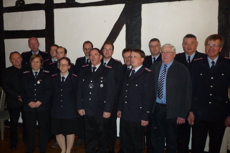 Gäste, Funktionsträger und Geehrte bei der FF-Jahreshauptversammlung Walmsburg, hintere Reihe von l. n. r.: Ortsvorsteher Wilhelm Kastens, Simon Ludwig und Cristopher Boll (stellv. Jugendwarte), Neuzugang Sven Weinert, Dennis Hensling (25 Jahre Mitglied), Otto Selonke (40 Jahre Mitglied), Kassenwart Frank Luerßen, stellv. Stadtbrandmeister Hermann Blanquett.Vordere Reihe von links nach rechts: Hartmut Gierung (50 Jahre Mitglied), Bleckedes Feuerschutzausschussvorsitzende Urte Schwaberau, Kinderfeuerwehrwartin Stefanie Morawe, Uwe Ludwig (40 Jahre Mitglied), stellv. Ortsbrandmeister und Jugendwart Markus Morawe, Ratsherr Uwe Ahrens, Ortsbrandmeister Friedhelm Hinrichs.