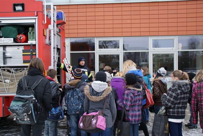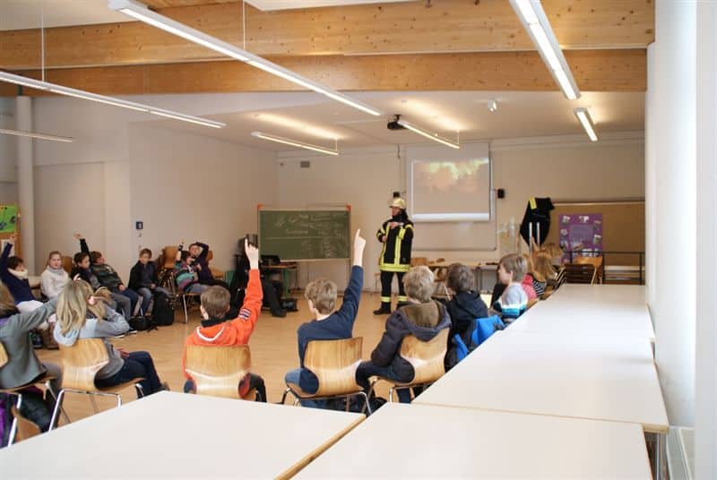 Über 100 Schüler aus vier Klassen nahmen an dem Feuerwehrprojektunterricht Teil – knapp ein Viertel der Schüler war bereits Mitglied einer Jugendfeuerwehr. Somit konnten in jeder Klasse „Fachleute“ über eigene Erfahrungen bei der Feuerwehr berichten.