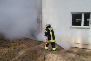Beim Eintreffen der ersten Einsatzkräfte stand Rauch über der kürzlich komplett sanierten Turnhalle. Erste Lagererkundungen von Einsatzleiter Dierk Schaack ergaben lediglich zwei Quadratmeter brennende Außenfassade.