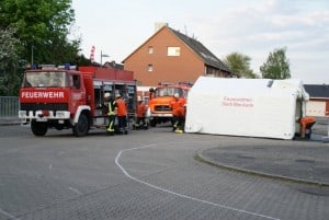 Die angenommene Lage war ein unbekannter Stoff im Altglascontainer auf dem Parkplatz des Schulzentrums. Die Gefahrgutgruppe sperrte den Bereich weiträumig ab und bereitete alles für einen Einsatz mit Chemikalienschutzanzügen vor.