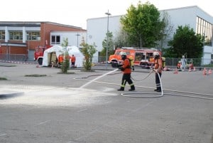 Die richtige Bereitstellung der Geräte ist eine wichtige Voraussetzung für den schnellen und sicheren Einsatz im Chemikalienschutzanzug. Diese Einsatzvorbereitungen waren Ziel des Übungsdienstes – der unbekannte Stoff wurde als relativ harmloses Reinigungsmittel identifiziert. Somit war ein Einsatz im Schutzanzug nicht mehr erforderlich – der „chemische Stoff“ wurde von Atemschutzträgern mit viel Wasser verdünnt.