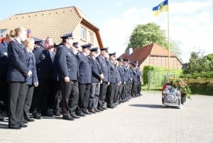 Foto 3: Die Feuerwehr Barskamp sowie Abordnungen aus Alt Garge, Walmsburg und Göddingen sind zur Übergabe angetreten.