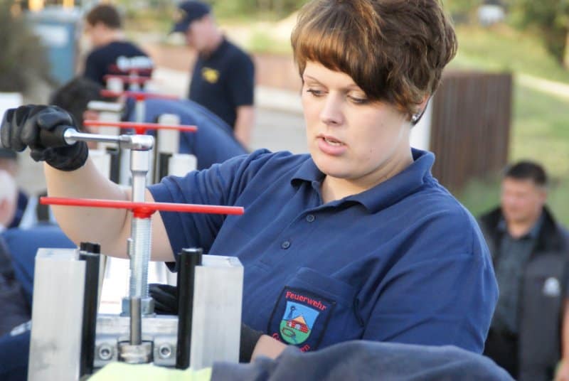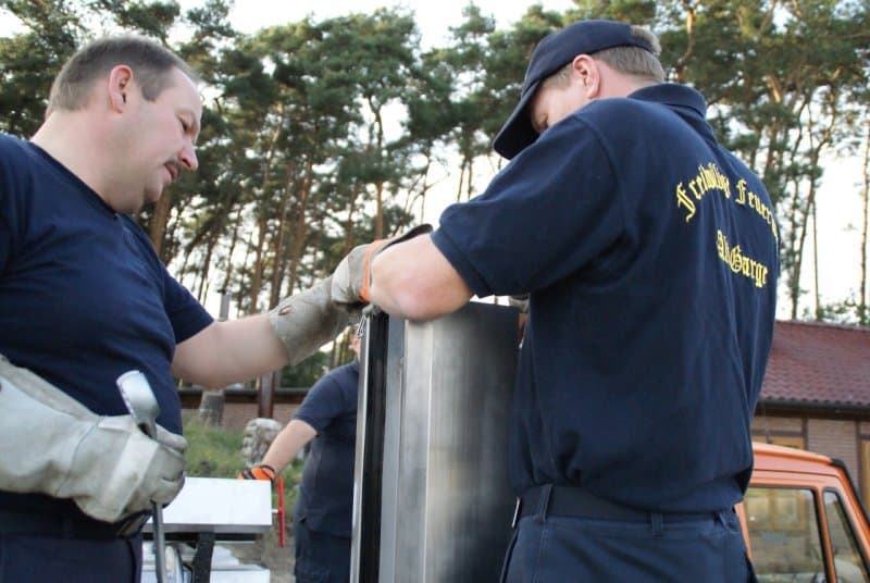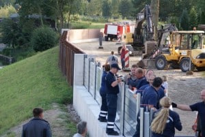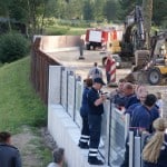 Mit dabei waren die Deichbaufirma Jeschke sowie die Firma ThyssenKrupp als Lieferant der mobilen Hochwasserschutzanlage. Gemeinsam mit den Spezialisten wurde die Wand errichtet und die Montage geübt.