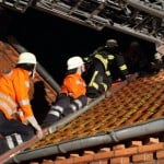 Foto 3 und 4: Einsatzkräfte stiegen Ortsbrandmeister aufs Dach: 30 Quadratmeter Dach wurden