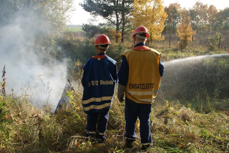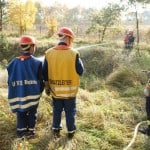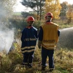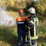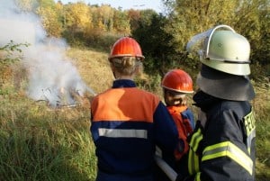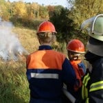 Am Sonntagvormittag konnten sich die Jugendlichen wie echte Feuerwehrmänner fühlen: Die Abschlussübung in einer Kiesgrube beinhaltete die Ausbildungsthemen des Vortages. Um das Holzfeuer zu bekämpfen achteten die Betreuer wieder auf Sicherheit: „An den Strahlrohren standen zusätzlich Erwachsene und der Sicherheitsabstand zum Feuer war für den reduzierten Wasserdruck fast zu groß. Aber das störte die Nachwuchseinsatzkräfte nicht.“
