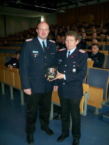 Foto: „Plakette“ v.l. Kreisbrandmeister Torsten Hensel, Kreissicherheitsbeauftragter Burkhard Jäkel.l.