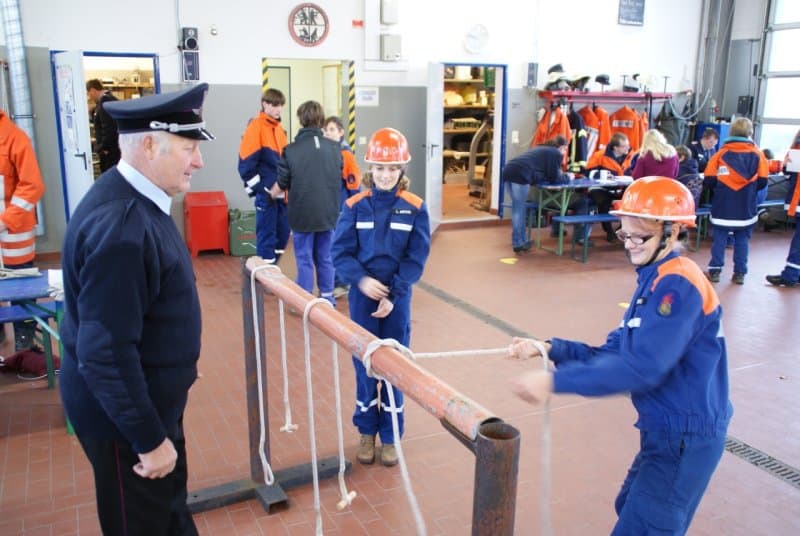 Feuerwehrtechnische Geräte wie Verteiler und Strahlrohre wurden erklärt und Fragen zu Schläuchen und Mülltrennung beantwortet. Das richtige Aus- und Aufrollen von Schläuchen sowie Knoten und Stiche waren die praktischen Prüfungselemente.