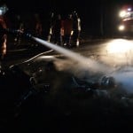 Die Feuerwehr löschte die Überreste des Wohnwagens ab und räumte den Schutt von der Straße.