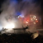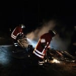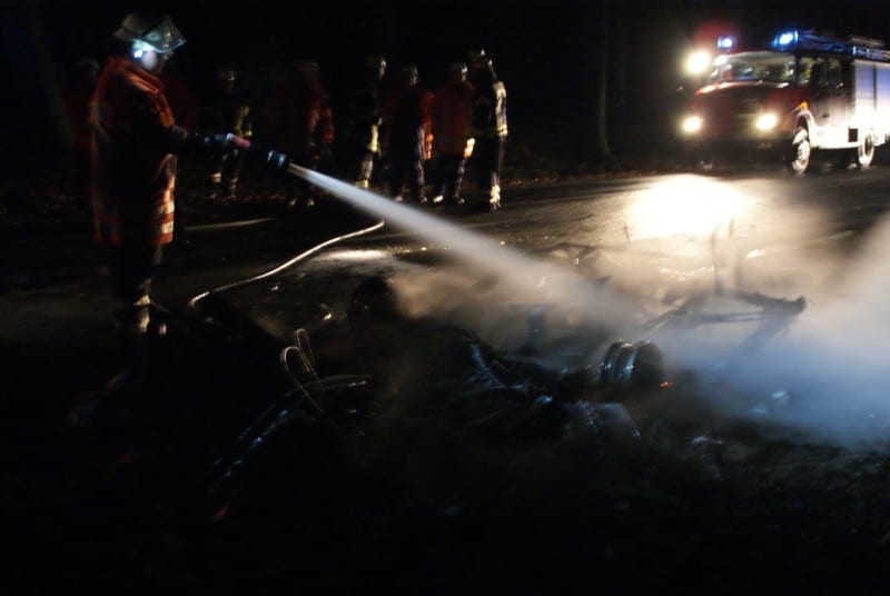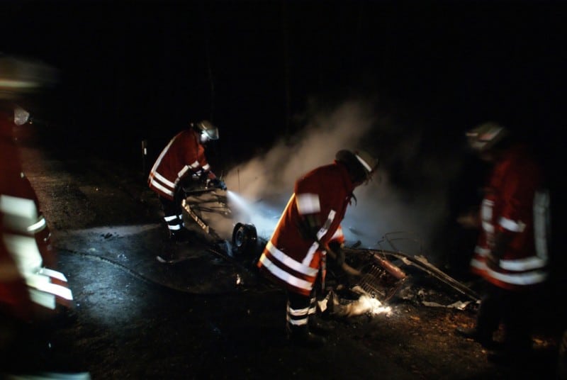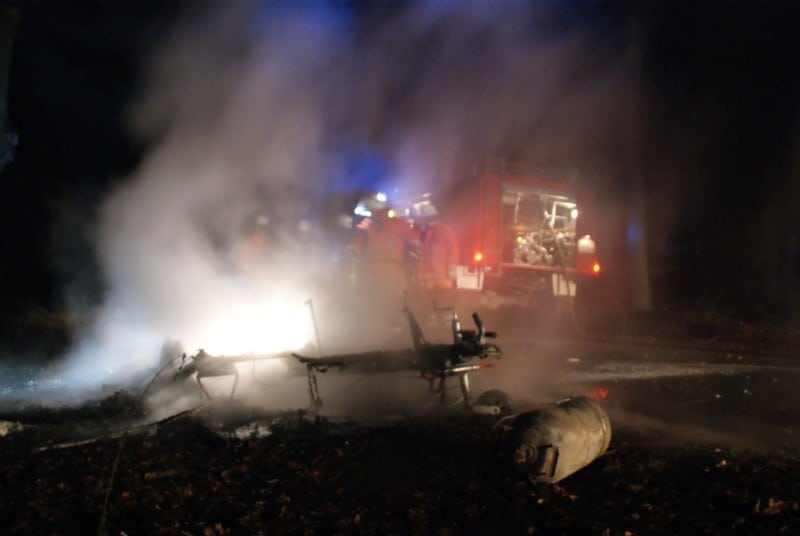 Zwischen Barskamp und Tosterglope brannte ein Wohnwagen neben der Straße. „Beim Eintreffen war kaum noch etwas übrig“ berichtete Einsatzleiter Jürgen Wienke. „Nur die Achsen und der Rahmen waren noch erkennbar. Die Gasflasche war auf der Deichsel befestigt“.