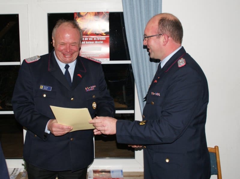 Kreisbrandmeister Hensel hatte noch eine Überraschung dabei: Henning Banse wurde für 40-jährige Mitgliedschaft in der Feuerwehr Göddingen ausgezeichnet.