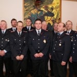 Foto 2: Die Geehrten: v.l. Stadtbrandmeister Henning Banse, Günther Schenk, Gruppenführer Carsten Banse, H.-J. Murck, Ortsbrandmeister Stefan Hoppe, Axel Jasker, Stellv. Bürgermeister Uwe Ahrens, Volker Claus, Eckhard Hoppe, Reinhard Hoppe, Stellv. Ortsbrandmeister Uwe Claus