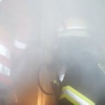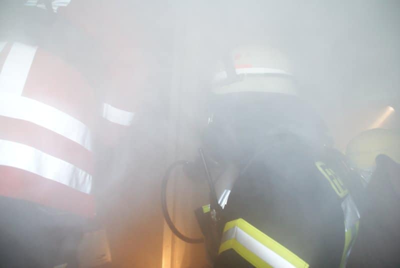 Foto 1 und 2: Atemschutztrupp am Treppenhaus – noch ist etwas Sicht, einige Meter weiter war keine Orientierung mehr möglich