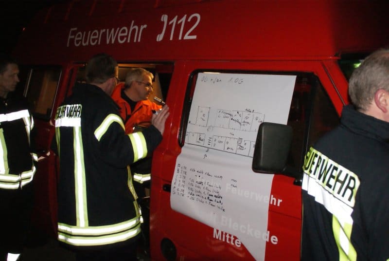 Garzes Ortsbrandmeister Thorsten Meyer war als Abschnittsleiter eingesetzt. Er zeichnete nach den Angaben der Atemschutztrupps den Gebäudeplan: „Bei dem unübersichtlichen Gebäude ist ein grober Plan schon eine Herausforderung. Ohne Sicherungsleine hätten die Trupps vermutlich nicht mehr hinausgefunden.“ Das konnte Jens Schaar nur bestätigen: „ Ab dem 2. Obergeschoss war der Nebel sehr dicht – die Lampen hatten fast keine Wirkung mehr. Die Trupps mussten kriechend die Etagen absuchen.“