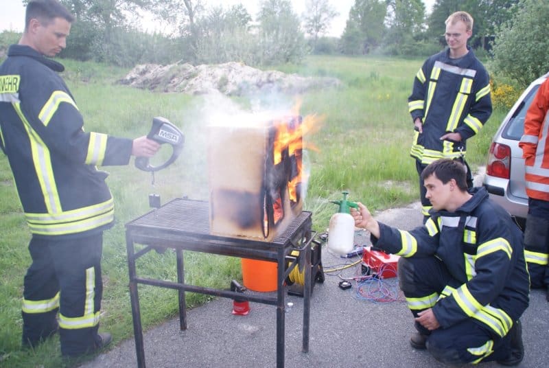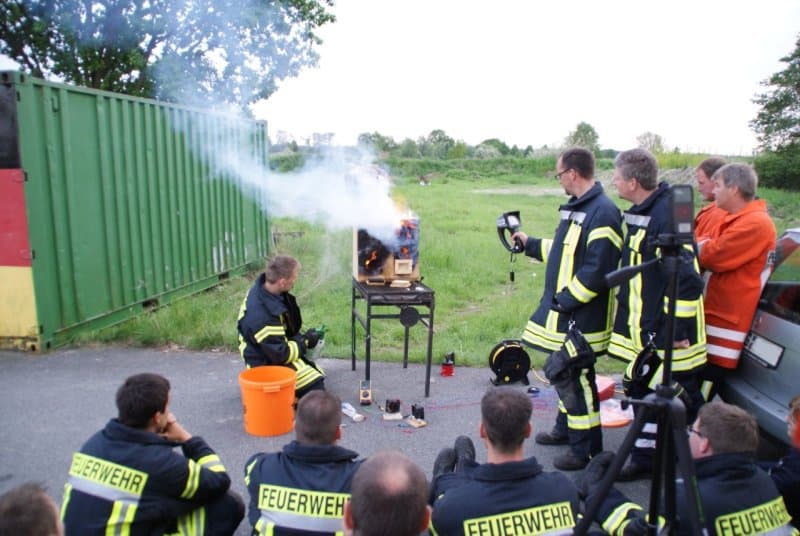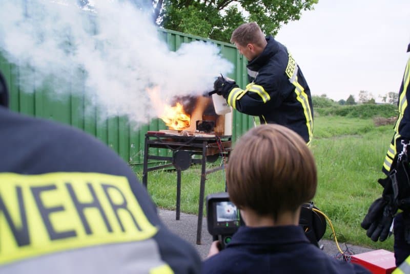 Henning Wanke hatte zur Ausbildung eine Hausattrappe gebaut. Es gab vier Räume mit Öffnungen und Verbindungen untereinander. In einem der Räume wurde Feuer gemacht. Mit Thermometern und der Wärmebildkamera konnte die Brandentwicklung und auch die Löschwirkung sehr gut beobachtet werden.