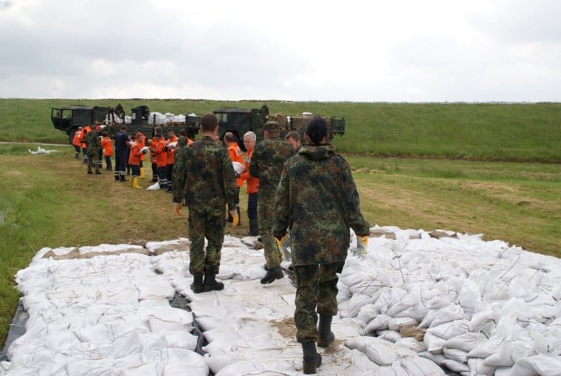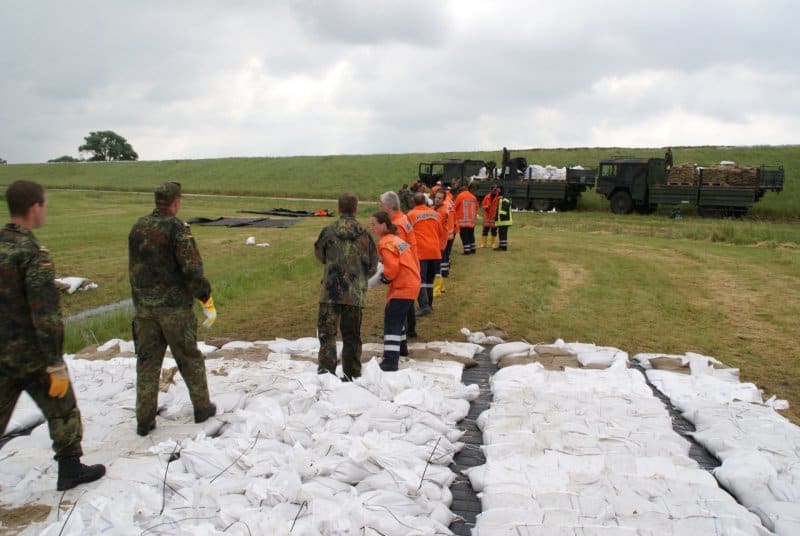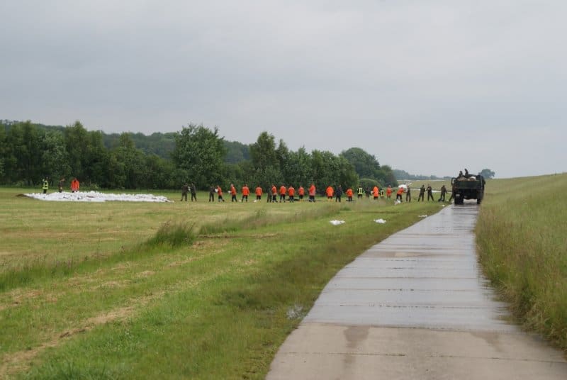 Im Bereich Heisterbusch treten immer wieder Sickerstellen auf. Durch den massiven Einsatz von Sandsäcken wurde die Gefahrenstelle durch Einsatzkräfte der Feuerwehr und der Bundeswehr gesichert.