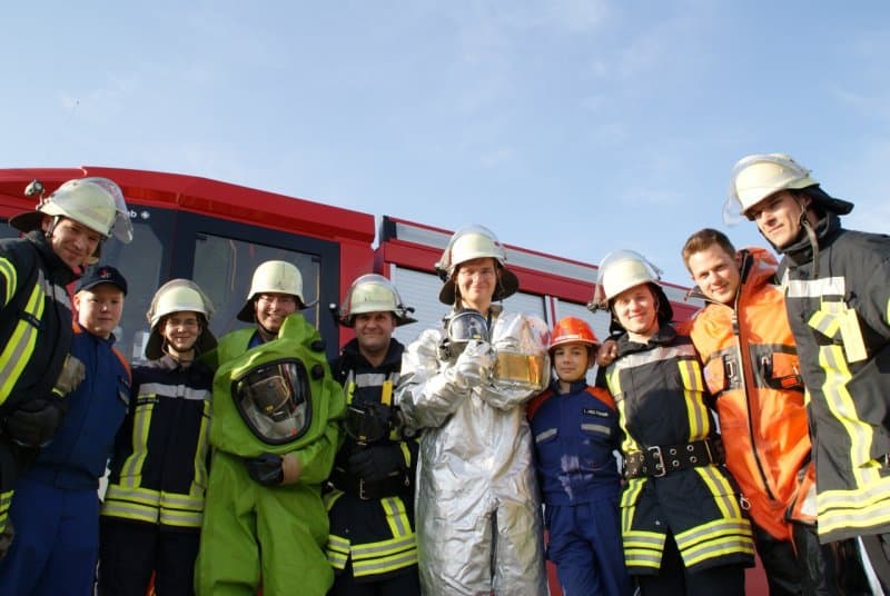 Das Foto zur Bewerbung zeigt Einsatzkräfte der Feuerwehr und Mitglieder der Jugendfeuerwehr.