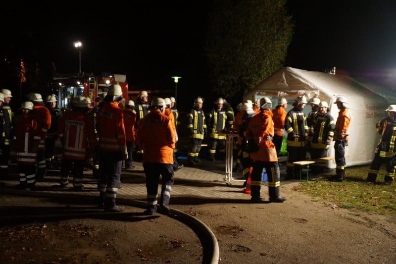 Der 4. Zug übernahm am Schützenplatz die Rolle der ersteintreffenden Ortsfeuerwehr und sperrte den angenommenen Gefahrgutunfall weiträumig ab. Nachdem der Löschangriff vorbereitet und die Einsatzstelle ausgeleuchtet war, rückte die Gefahrgutgruppe an.
