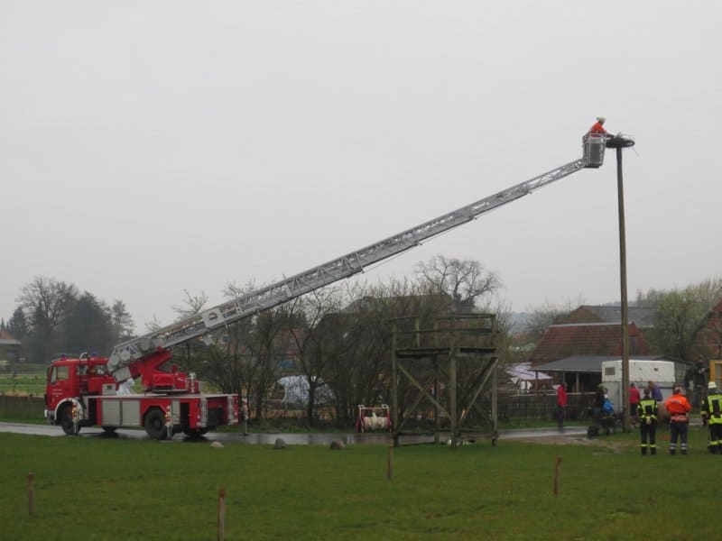Die Feuerwehr Walmsburg reparierte beim letzten Übungsdienst das Storchennest am Sportplatz. Bei der Reparatur unterstützte die Feuerwehr Bleckede mit der Drehleiter.