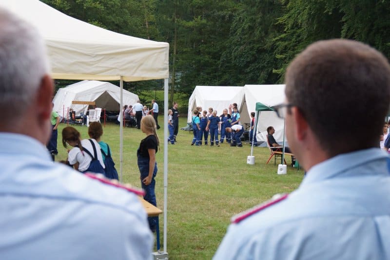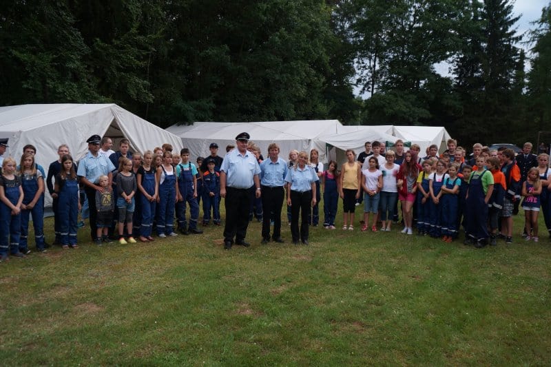 Stadt-Jugendfeuerwehrwart Henrik Schulz und der Stellv. Stadtbrandmeister Hermann Blanquett haben das Zeltlager mit knapp 100 Teilnehmern heute um 19:00 im Waldbad Alt Garge eröffnet.