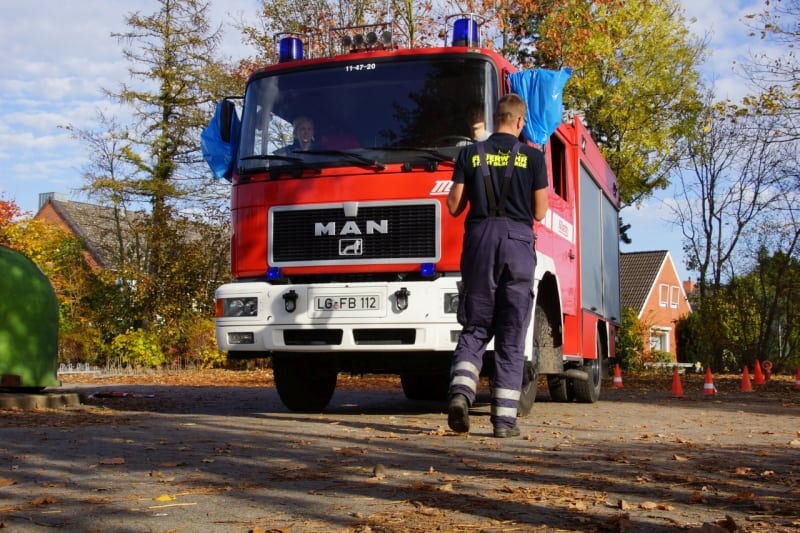 Foto 1: Rückwärts mit Einweiser und abgedeckten Spiegeln – das Löschguppenfahrzeug der Feuerwehr Bleckede