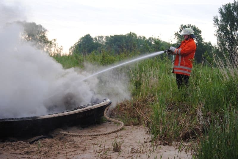 Kurz danach: Einsatzabbruch – Brennendes Boot bereits am Ufer und Feuer unter Kontrolle. Brandbekämpfung durch die Feuerwehr Artlenburg am Ufer, keine Person auf dem Boot.