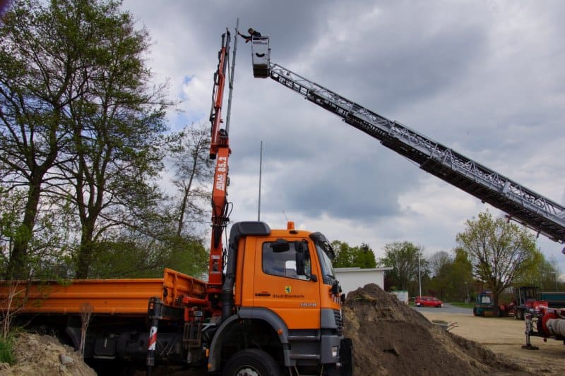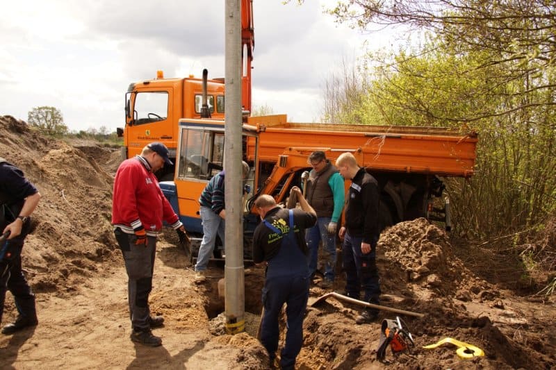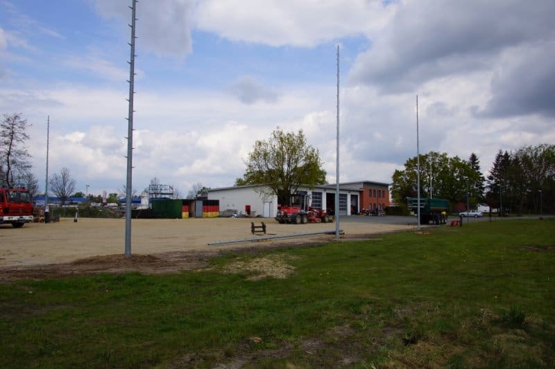 Heute Vormittag wurde der Platz durch 21 Einsatzkräfte der Feuerwehr weiter ausgebaut: Fünf ca. 10 Meter hohe Flutlichtmasten wurden durch die Feuerwehr gesetzt und somit die Nutzungsmöglichkeiten des Geländes erweitert. Unterstützung hatte die Feuerwehr durch Thorsten Wiswe, der als Leiter des Bauhofes der Stadt Bleckede neben dem nötigen Fachwissen auch entsprechende Baumaschinen mitbrachte. Der Kies für die Betonfundamente der Lichtmasten wurde von der Firma Hartmann zur Verfügung gestellt.