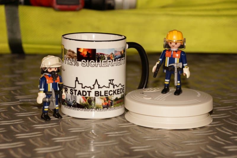 Die Tassen und Rauchmelder können am Sonntag ab 10:00 am Stand der Feuerwehr beim „Hafensonntag“ in Bleckede abgeholt werden.