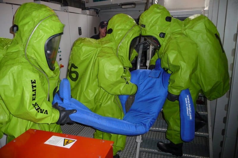 So galt es, mehrere Lagen parallel abzuarbeiten. Im Aggregatraum eines Schiffes wurde das Auslaufen von Schwefelsäure simuliert, welche durch einen ABC-Erkundungstrupp aus Boizenburg/Elbe unter CSA (Chemikalienschutzanzug) erforscht wurde. Auch die Umgebung galt es zu schützen, so wurde neben dem in grünen Anzügen gekleideten Trupp eine Wasserwand zum Niederschlagen der Gase errichtet. Gleichzeitig sorgten die Brandschützer aus Lauenburg/Elbe für eine Ölsperre um das Schiff herum. Dieses nicht alltägliche Szenario war, trotz der Ruhe einer Übung, in etwa einer Stunde nach Beginn ausgeführt.