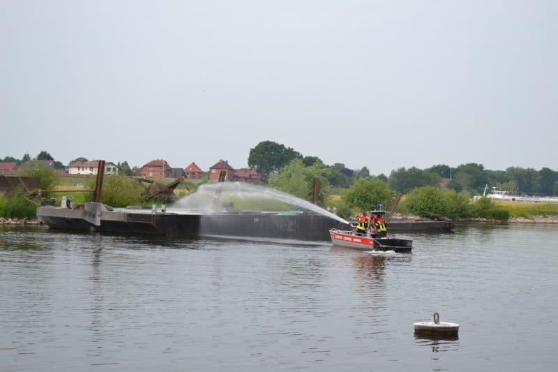 Am anderen Ufer kämpften die Feuerwehrleute aus Bleckede derweil mit einem Ponton, von dem man annahm, es sei ein brennendes Tankschiff, auf dem Schweröl lagerte. Eine heikle Angelegenheit, da ein Schwerölleck (als Gas austretend) hochexplosiv wäre und die Bootsmotoren, im Ernstfall, augenblicklich hätten ausgestellt werden müssen. Zum Glück entschied man sich bei dieser Übung für die ungefährliche Variante, und so konnte das Feuerwehrboot samt Crew die anstehende Menschenrettung durchführen, um danach vom Boot aus, mit einem Wasserwerfer, das Tankschiff abzulöschen.