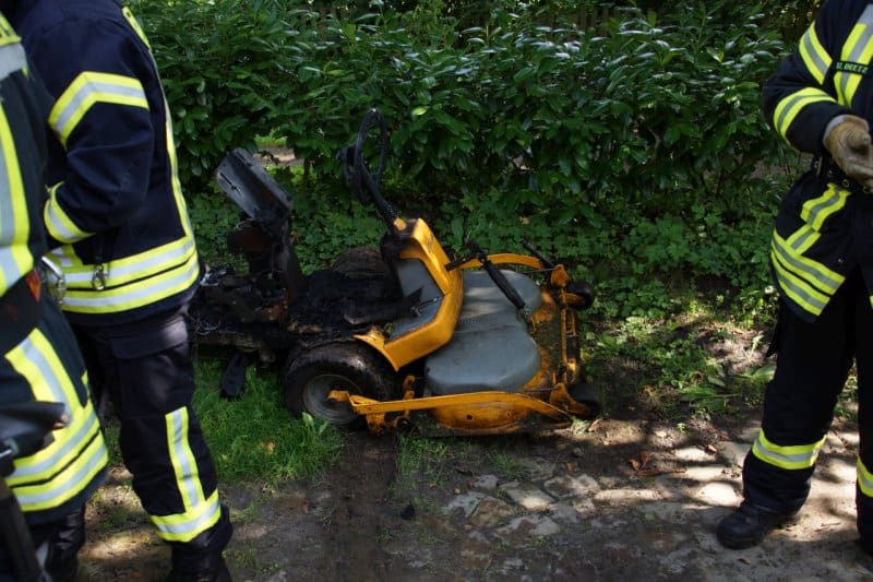 Anwohner löschten den brennenden Rasenmäher in der Scheune mit Gartenschlauch und Pulverlöschern und verhinderten so einen Scheunenbrand.